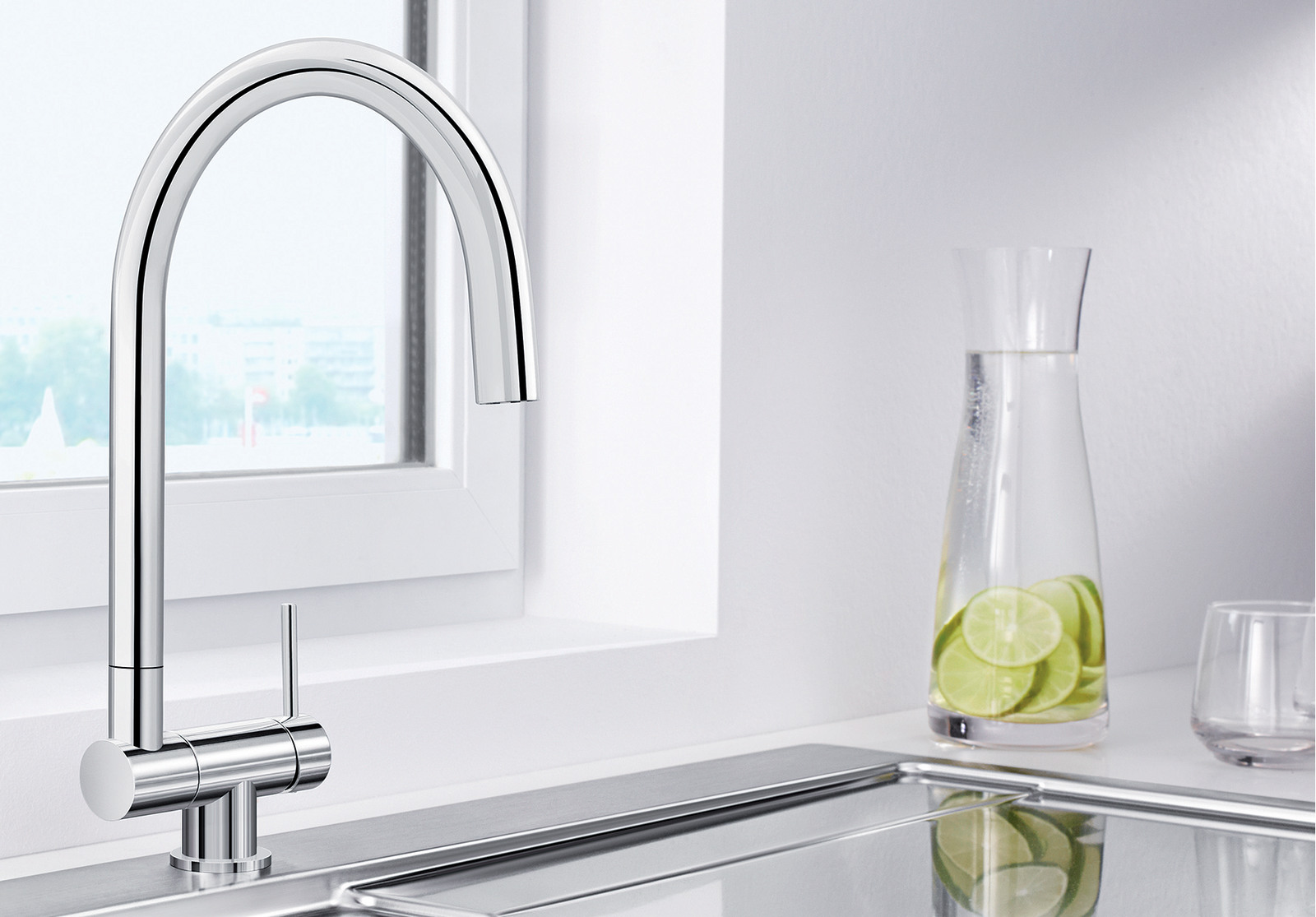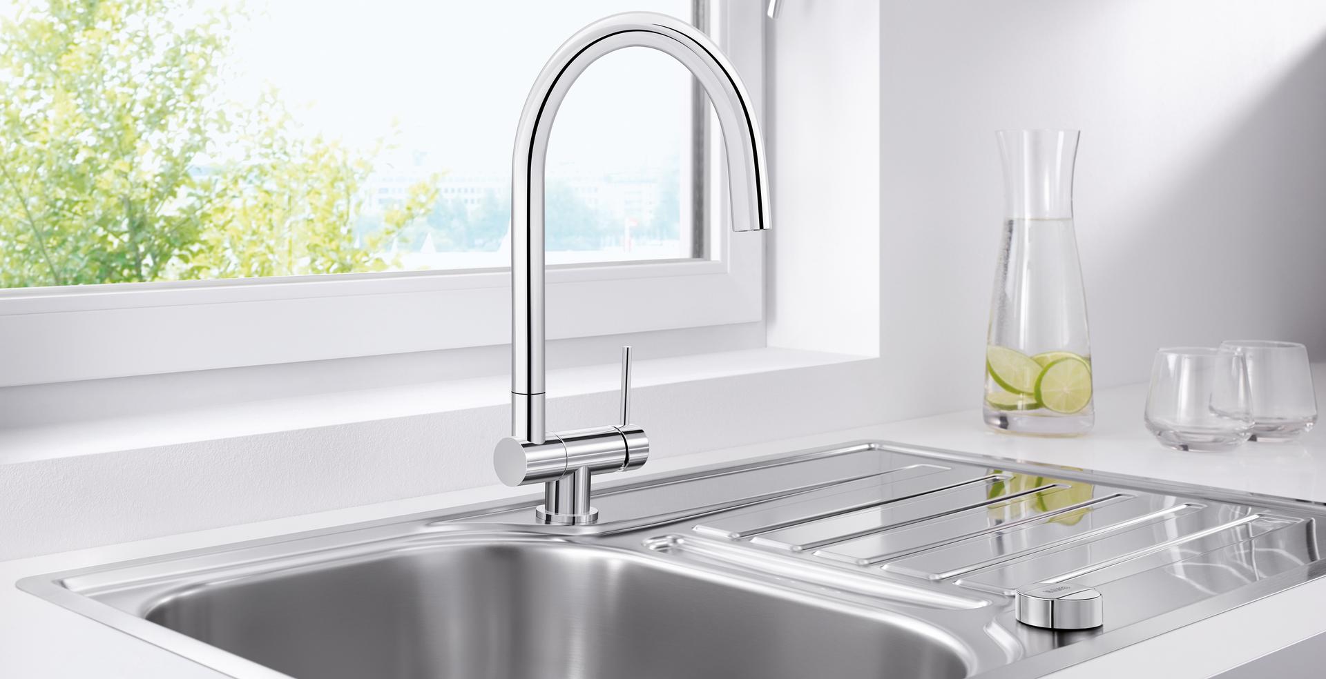 Складной смеситель для установки перед окном Blanco Coressa-F выпускается в двух вариантах: с рычагом справа и слева. Очень удобный смеситель, который подойдет вам, если вы решили установить кухонную мойку перед окном: высокий излив смесителя легко складывается, наклоняясь вперед.